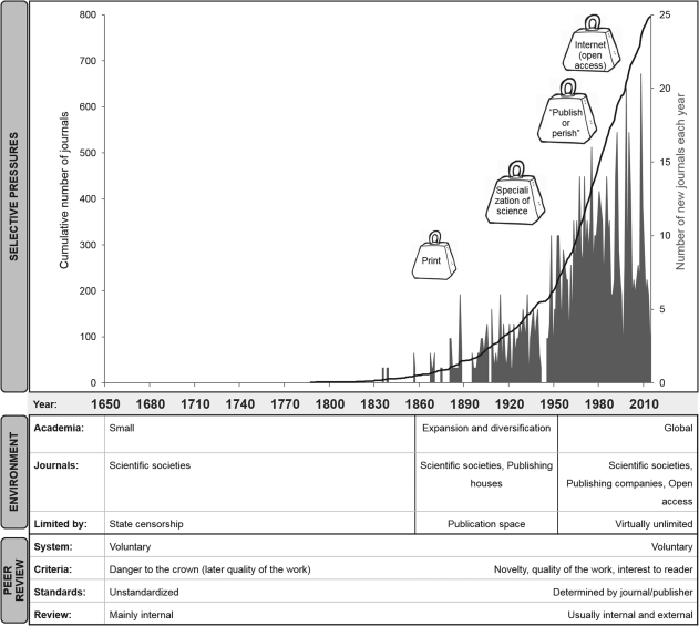 גרף המראה עלייה במספר כתבי העת בתחום אקולוגיה/אבולוציה וה"לחץ האבולוציוני" המוביל לשגשוג כתבי העת. מקור: Ferreira et al. (2015) Biological Reviews. DOI: 10.1111/brv.12185