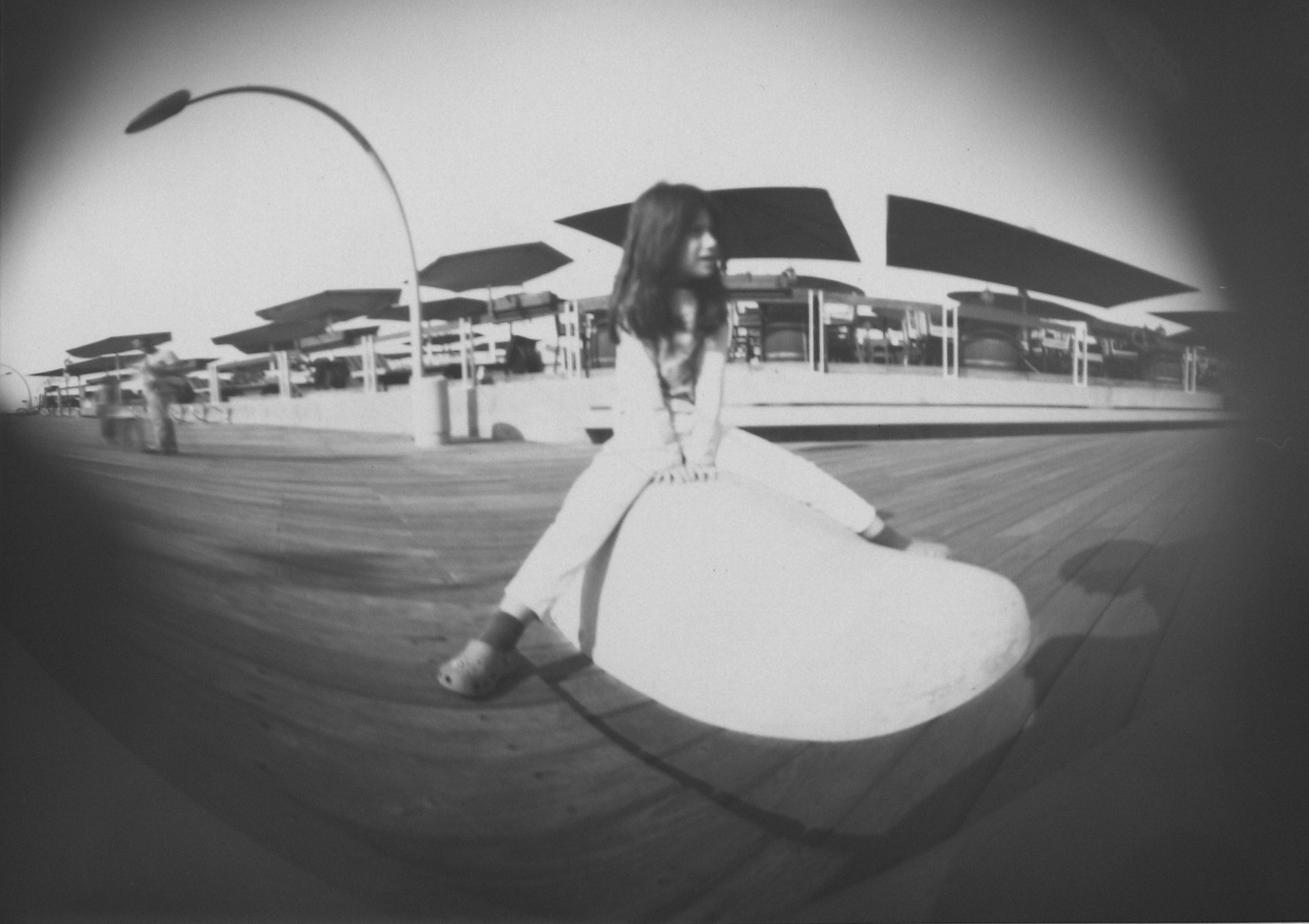 ועוד משהו לסיום, בהקשר של ה"קמרה אובסקורה". כך נראה צילום דרך מצלמת חריר שצילמתי יחד עם הבת שלי, במסגרת הפעלה מגניבה לילדים לפני כמה שנים בנמל ת"א. המצלמה: פחית קפה שבדופן שלה חורר חור בקוטר מילימטר ובתוכה נייר צילום. לאחר שהכנסנו את נייר הצילום לתוך הפחית בחדר החושך, סגרנו את המכסה, אטמנו את החריר בפיסת איזולירבנד שחור ויצאנו החוצה לצלם. כל אחד הניח את ה"מצלמה" שלו על משטח יציב, פתח את החריר למספר שניות וסגר חזרה. חזרנו לחדר החושך ופיתחנו את הצילומים. זה מה שיצא לנו (אותי רואים בצל מצד ימין):